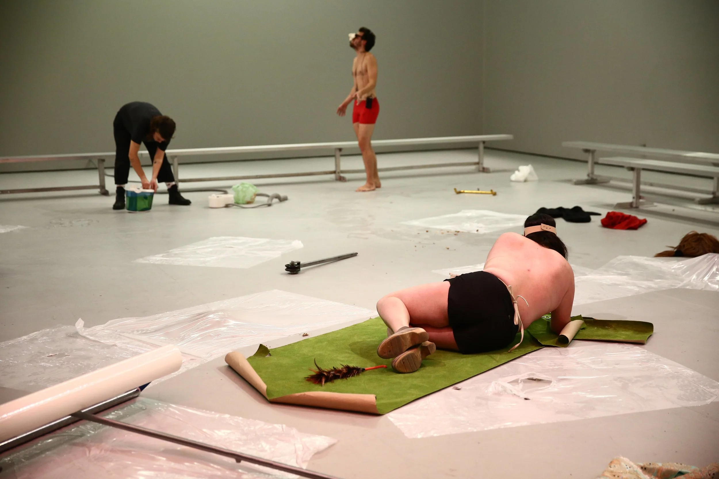 Swivel Spot is concerned with the indiscernible moment of change. It is clear that something is gone. Actions of preservation and maintenance suggest something routine is about to happen. There is preparation here. Haunting the performance are the remains–a skeleton of logic from something that no longer applies. Still, these things don’t just go away. Hovering in this spot, an area isolated for this specific function, likened to a dump, a graveyard for parts, or a recycling shed, but we remain, there is waiting here. In a “land-space” where things go to die, rest, pile up, and accumulate, we see what we return to, pivot on, flirt with, linger near, or even consistently resist. Can we measure or archive transformation inside of this pile, and how do we continue on without rendering it obsolete? Swivel Spot is a companion work to Clap Hands (2016).